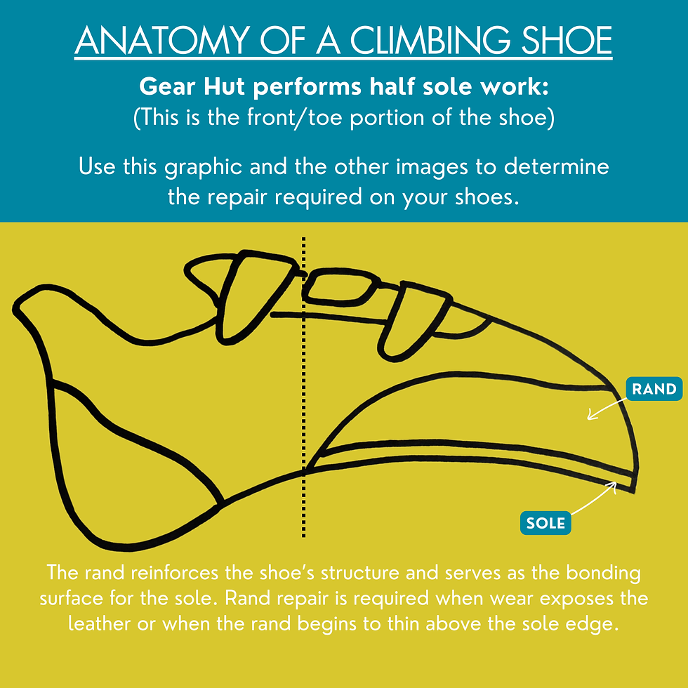 Note: Gear Hut's resoling service aims to serve as a reliable resource for Reno’s climbing community, dedicated to maintaining low turnaround times. To ensure we can help serve as many climbers as possible, drop-offs are limited to ONE pair of shoes serviced at a time. (Two people dropping off 4 pairs each = Six people we can't serve).